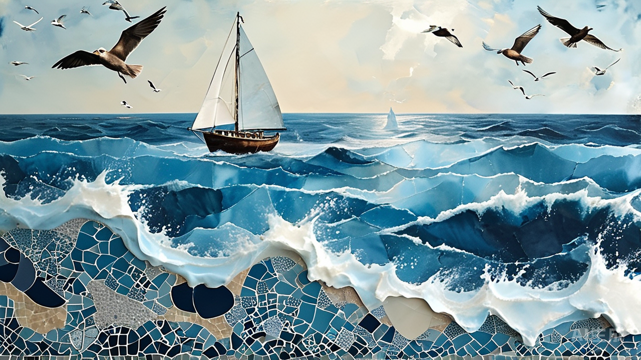 更有蓝白共舞的写意妙境。釉彩流动如墨,青花晕染在柔白胎底上,勾勒出浪涛卷曲的柔线、海鸟掠翼的弧痕。线条仿佛随性游走,却又暗含海风与波浪的韵致。至于马赛克拼贴,蓝白碎瓷如被浪涛揉散的贝壳与砂粒,层层叠叠,在光下闪烁不定,拼接出光影律动的抽象海图,让人错觉阳光正穿透水面,在瓷砖上投下粼粼波光。