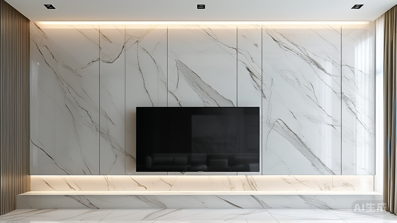 整面铺陈的大幅瓷砖,以其近乎无痕的延展性,悄然抹去了空间的局促感。拼缝的消隐,让地面与墙面浑然一体,视线再无阻碍,空间仿佛被无形之手向上、向远推展,气度自然舒张开来。晨曦微光或暮色灯火拂过,卡拉拉白温润如玉的表面便泛起一层柔和光晕,如同覆上薄纱。纹理在光影的抚触下被赋予生命,深浅层叠、若隐若现,空间因此流转着静谧而丰富的韵律。光影在此间低徊,为轻奢的理性基调注入一丝自然的灵动与深邃的质感。 它不喧哗,却以无声的力量奠定了空间的基调。无论是延伸至通顶的电视背景墙,抑或整面铺陈于地面,大幅面的卡拉拉白都以其沉静的力量感,构筑起客厅的骨骼。其色泽清雅、纹理磅礴,如同一曲低回而壮阔的无声乐章,在每一处转折与光影里,悄然提升着空间的内在张力与尊贵气质。