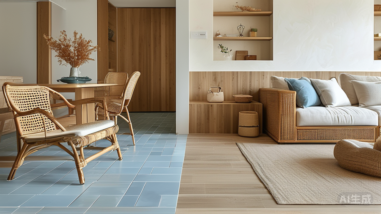 三、融合的巧思:边界与层次的精妙处理 真正的完美融合,在于细节处的无缝衔接。瓷砖与木纹的碰撞,最忌生硬的分割。可以采用通铺的方式,让奶油色瓷砖与木纹砖在同一个空间内自由延伸,利用颜色和质地的过渡来划分功能区域,而非传统的门槛石。例如,在玄关或厨房用水区采用瓷砖,过渡到客厅或卧室区域则采用木纹,这种无高低差的处理方式,既满足了功能性,又保证了视觉的整体流畅。此外,在家具的选择上,可以挑选一些带有藤编、棉麻等自然元素的单品,它们能作为中间介质,巧妙地衔接起瓷砖的“冷”与木纹的“暖”,让整个空间的材质语言更加统一、丰富。